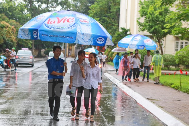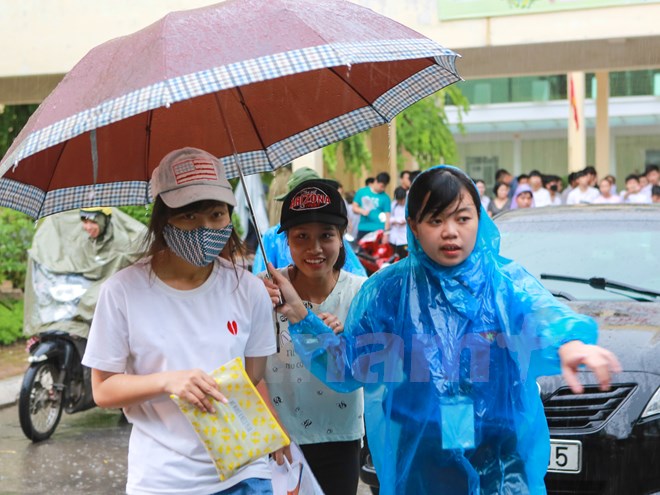 Sinh viên tình nguyện đội mưa ‘giải cứu’ thí sinh ra khỏi khu vực thi trong cơn mưa tầm tã chiều 2/7... (Ảnh: Minh Sơn/Vietnam+)