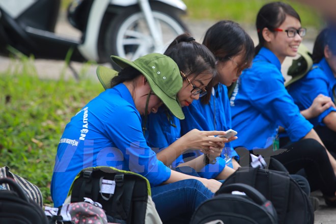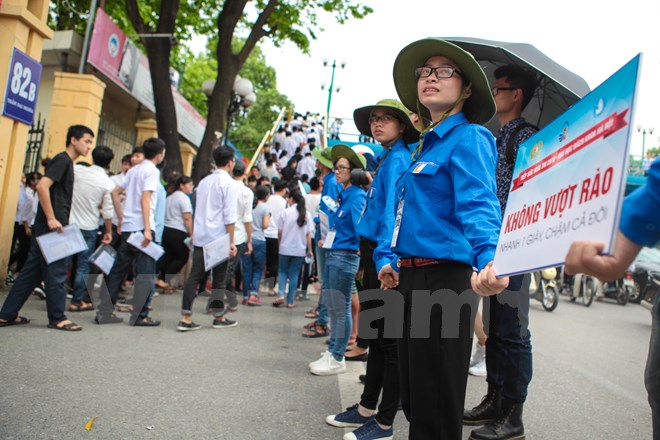 Hình ảnh những sinh viên, thanh niên, tình nguyện viên không quản thời tiết nắng nóng, tận tình hướng dẫn thí sinh, phụ huynh để lại nhiều ấn tượng tốt đẹp. (Ảnh: Minh Sơn/Vietnam+)