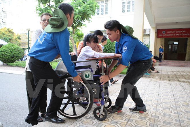 Hay hỗ trợ những thí sinh khuyết tật vào phòng thi. (Ảnh: Minh Sơn/Vietnam+)