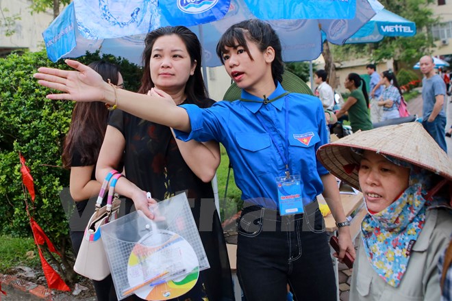 Tận tình hướng dẫn phụ huynh thí sinh đến địa điểm chờ con em mình. (Ảnh: Minh Sơn/Vietnam+)