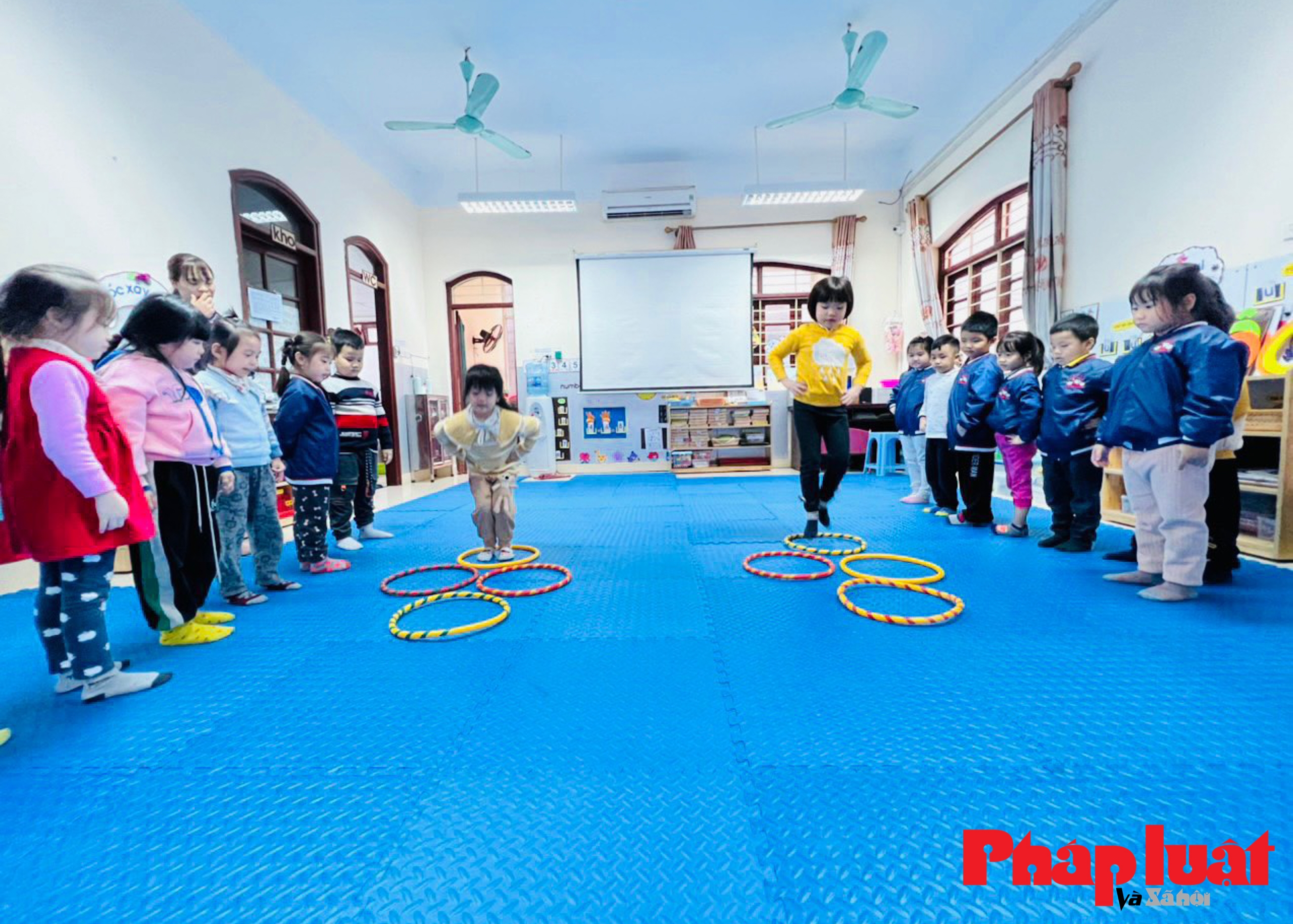 | "Mặc dù trong lớp nhưng các con vẫn đảm bảo cường độ vận động đủ để xả năng lượng do diện tích trong lớp cũng khá rộng cho các hoạt động vận động vừa đủ. Có thể thay vì chạy, các cô cho các con các bài tập bò trườn, bật nhảy, chuyền tay, nhảy tại chỗ..." - Hiệu trưởng trường mầm non Phùng Khoang thông tin. |