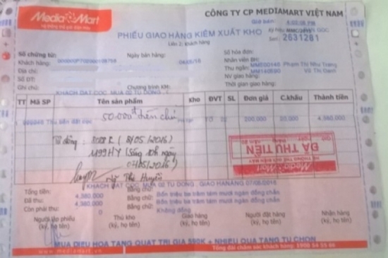 Cụ thể, theo chị Hải vợ anh Trung, ngày 4/5, vợ chồng chị đến siêu thị mua tủ lạnh có chọn 2 mã sản phẩm là tủ đông 8088K và 1199HY . Sau đó anh chị làm thủ tục, tạm ứng hơn 4 triệu đồng và nhận một Phiếu Giao hàng kiêm xuất kho ghi rõ thời gian giao hàng:"Tủ đông: 8088K (8/05/2016); 1199HY (sáng 10h ngày 07/05/2016)". Ký xác nhận là nhân viên Nguyễn Thị Huyền. Đến sáng ngày 7/5, gia đình chị Hải đã nhận được sản phẩm mã 1199HY.