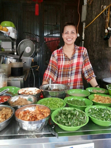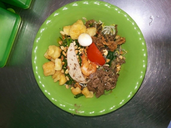 Không bày biện sang trọng, bà chủ quán chỉ đặt bày bàn ghế nhựa ra sân khu tập thể có bóng cây xanh cho khách hàng ngồi. Trưa hè nóng nực, ánh nắng xuyên cả vào chỗ ngồi mà khách hàng không quan tâm, ngồi ăn một cách ngon lành. Họ trò chuyện rôm rả đến mức quên cả không khí oi bức xung quanh.
