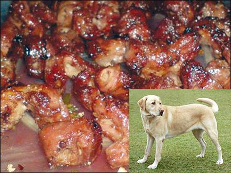 Tại các nhà hàng chuyên về thịt chó. Có 3 món phổ biến là: Cà chó hấp cách thủy, cà chó nướng và rượu Tam cường (gồm có thận chó, tinh hoàn chó, dương vật chó, và các vị thuốc: đẳng sâm, đỗ trọng, ba kích thiên, đại táo, nhục thung dung, cẩu tích).