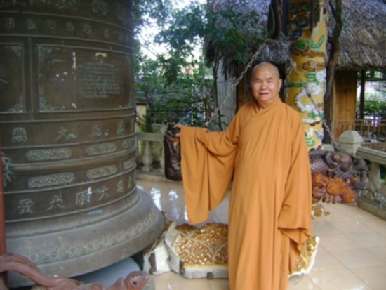 Hòa thượng Thích Minh Hiển bên quả Đại Hồng Chung tại tu viện Bát Nhã khởi công 22-7 năm Ất Hợi, nặng 6 tấn. Ảnh: M.Dung