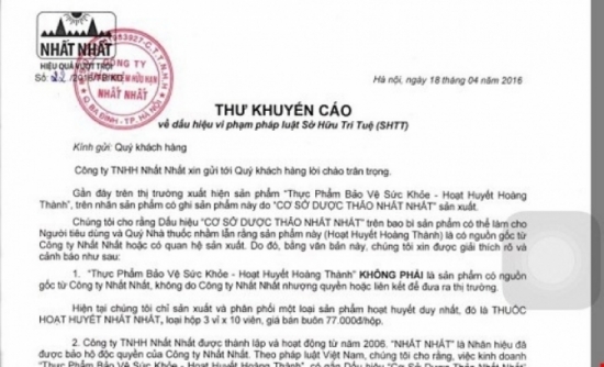 Theo như nội dung bức thư “Khuyến cáo” có dấu hiệu vi phạm Pháp luật này thì, tại mục 2, Công ty TNHH Nhất Nhất nói: “Theo Pháp luật Việt Nam, chúng tôi cho rằng việc kinh doanh Thực phẩm bảo vệ sức khỏe - Hoạt huyết Hoàng Thành có gắn dấu hiệu của Cở sở dược thảo Nhất Nhất mà không có sự đồng ý của Công ty Nhất Nhất có thể đã vi phạm Pháp luật và xâm phạm đến quyền sở hữu trí tuệ của Công ty Nhất Nhất…”.