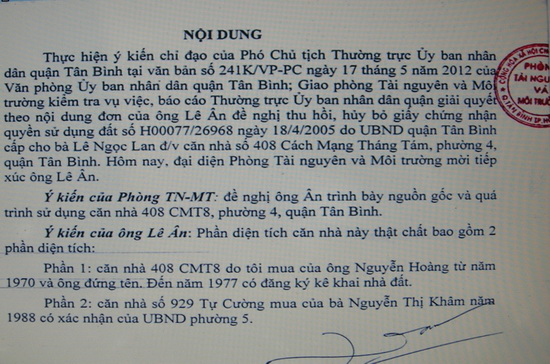 Nội dung trình bày của ông Lê Ân khi làm việc với Phòng Tài nguyên môi trường quận Tân Bình, TP HCM.