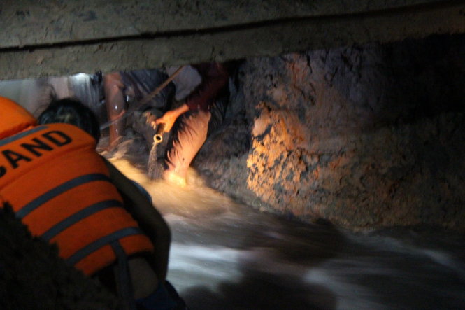 | Lực lượng tìm kiếm phải lặn xuống cống, chặn cuối dòng chảy để mò thi thể cháu Tỷ |