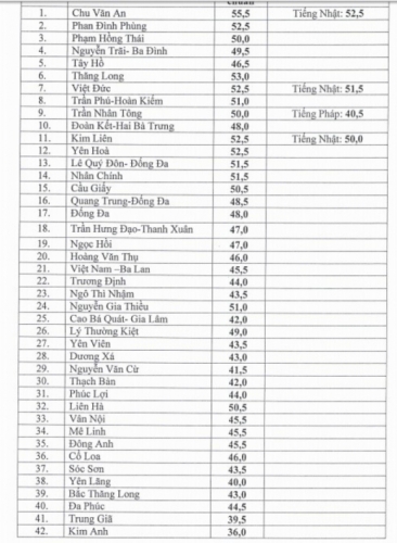 Cụ thể, THPT Chu Văn An là 55,5 điểm. THPT Thăng Long lấy điểm đầu vào là 53. Điểm chuẩn vào THPT Việt Đức, THPT Phan Đình Phùng, THPT Kim Liên, THPT Yên Hòa là 52,5 điểm.