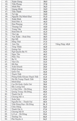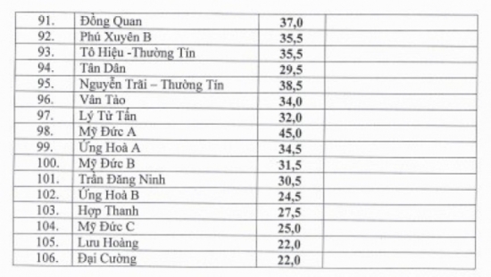 Top các trường lấy điểm đầu vào lớp 10 thấp nhất thành phố gồm THPT Lưu Hoàng, Đại Cường; THPT Minh Quang; THPT Mỹ Đức; THPT Bất Bạt... ở mức từ 22 đến 24,5 điểm.