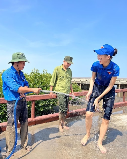 | Diện màu áo xanh đầy tự hào của Đoàn thanh niên, nàng hậu không ngại ngần xắn tay, bước xuống lớp bùn để trồng những cây đước, cây mắm tại Vườn quốc gia Cà Mau. Cây mắm sẽ cắm rễ, giữ những trái đước ngừng trôi khi gặp nước để những trái này mọc thành rừng giữ đất. |