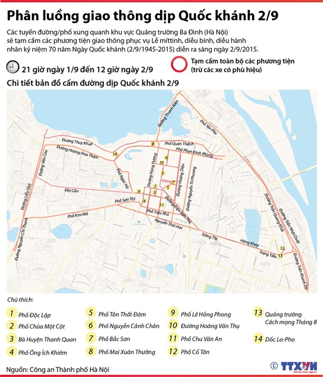 Từ 21 giờ ngày 1/9, nhiều tuyến phố ở thủ đô Hà Nội sẽ cấm mọi phương tiện giao thông qua lại để phục vụ cho lễ diễu binh, diễu hành mừng 70 năm Quốc khánh vào sáng ngày 2/9. -
