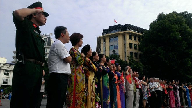 Người dân trang nghiêm đứng chào cờ tại Quảng trường Cách mạng tháng Tám. -