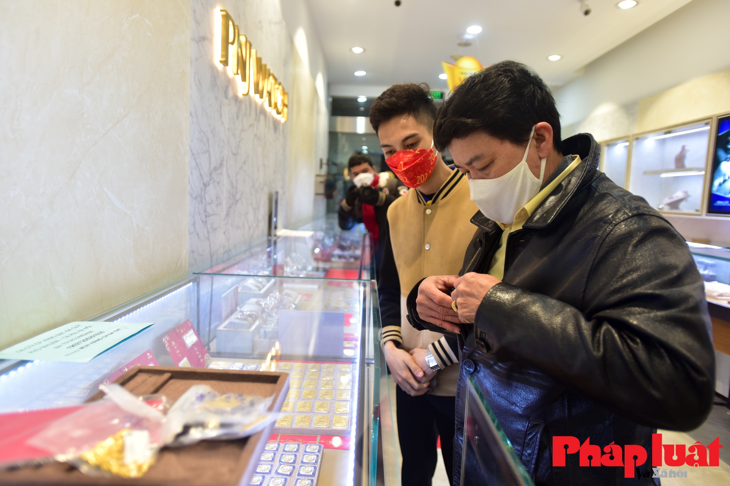 | Tại cửa hàng vàng PNJ trên phố Trần Nhân Tông, lượng khách mua không đông đúc chen chúc, người ra vào mua vàng đảm bảo phòng dịch. |