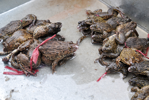 | Ếch Trung Quốc (trái) thường to, béo gấp rưỡi ếch ta, da có màu xanh, trong khi ếch ta thường nhỏ, gầy và da đen, xù xì. |