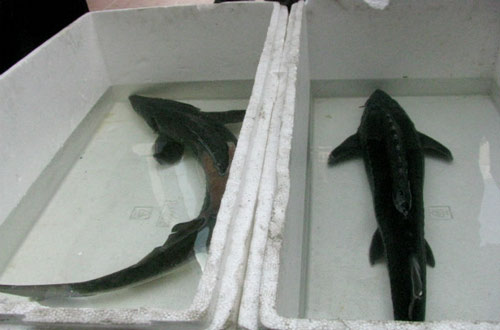 | Cá tầm Trung Quốc (phải) béo và thân ngắn. Cá tầm Việt Nam thân thon dài, da sáng và trơn hơn cá tầm ta |