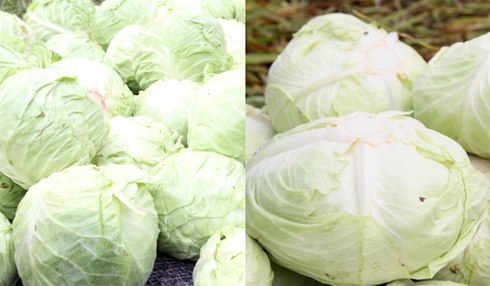 | Bắp cải Trung Quốc thường được bọc trong túi lưới, dạng tròn, to bằng nắm tay, xanh nhạt, lá xoăn (trái). Còn bắp cải ta to, màu trắng (phải). |