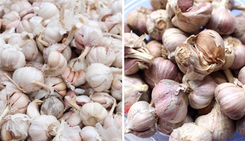 | Tỏi Trung Quốc (trái) thường nhiều tép, củ to, vỏ mỏng, rất dễ bóc, có vị hăng, the. Tỏi ta có nhiều loại song củ nhỏ, khó bóc, vị thơm rất đặc trưng. |
