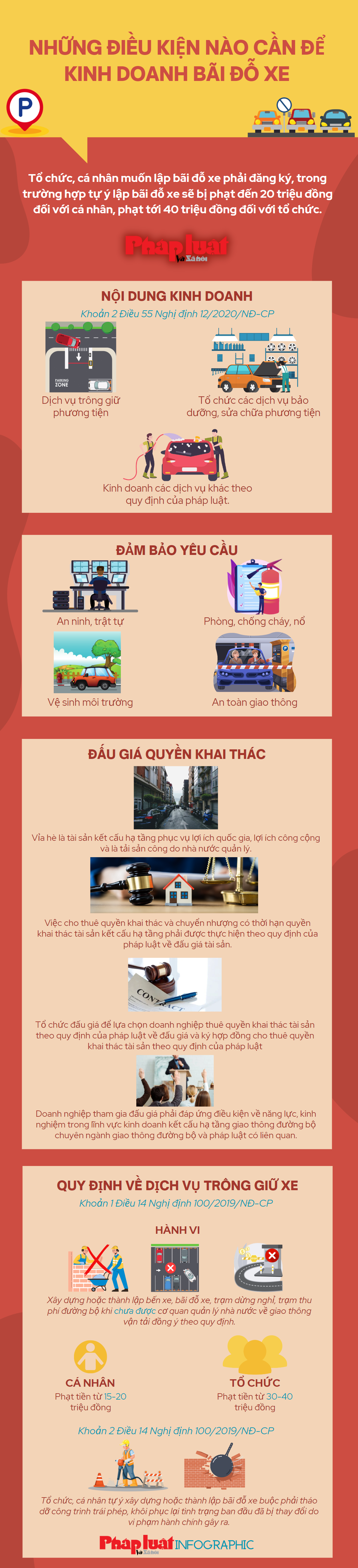 Theo dõi Pháp luật & Xã hội trênTổ chức, cá nhân muốn lập bãi đỗ xe phải đăng ký, trong trường hợp tự ý lập bãi đỗ xe sẽ bị phạt đến 20 triệu đồng đối với cá nhân, phạt tới 40 triệu đồng đối với tổ chức.