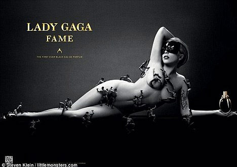 Trước đó, nữ ca sĩ Born This Way đã có màn PR rất táo bạo cho Fame bằng hình quảng cáo nude, những phần cơ thể cần che là những hình người đàn ông tí hôn đang bám víu, bò leo khắp người.