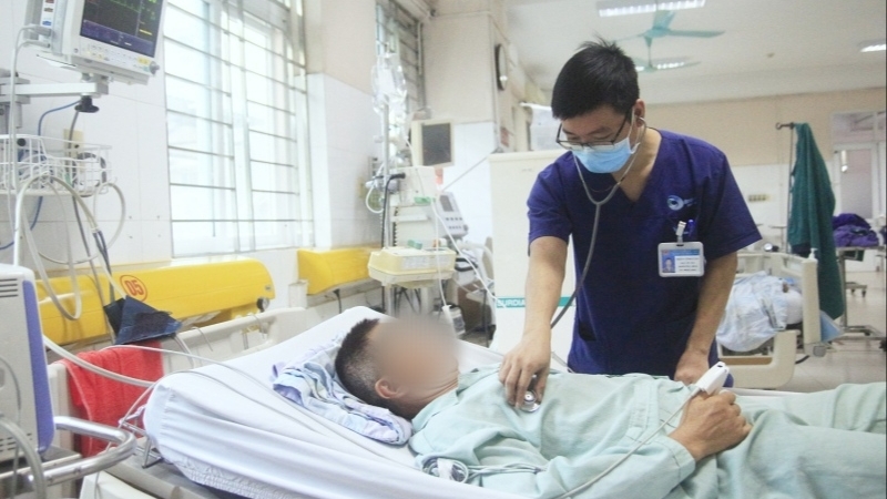 | TS.BS Lê Quốc Hùng, Trưởng khoa Bệnh Nhiệt đới, BSCK2 Trần Thanh Linh - Trưởng khoa Hồi sức Cấp cứu, Bệnh viện Chợ Rẫy thăm khám cho bệnh nhân ngộ độc. |