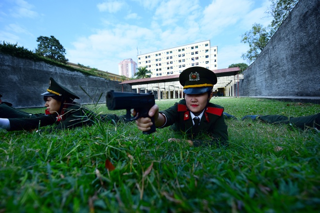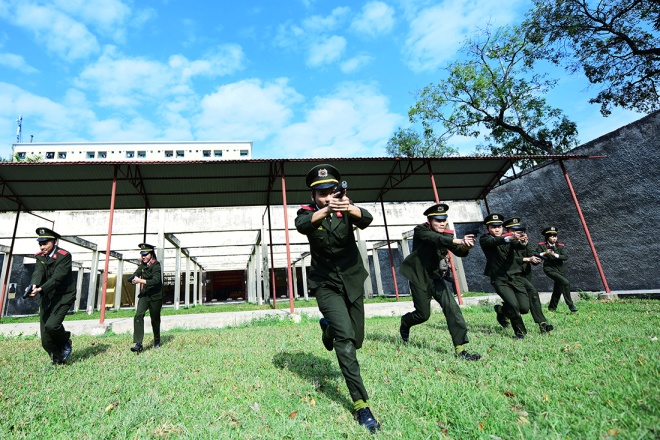 Nội dung bắn súng ngắn, học viên phải tham gia các bài tập giả định tình huống có thể xảy ra để biết cách xử trí và có kỹ năng, kỹ thuật tác chiến. Trong ảnh là bài tập kỹ thuật vận động trong chiến đấu lợi dụng địa hình, địa vật để truy kích, bắt mục tiêu. Sinh viên phải cầm súng đi khom, trườn, lăn trái - phải, nằm, quỳ, thậm chí lộn ngửa rồi ngắm bắn.