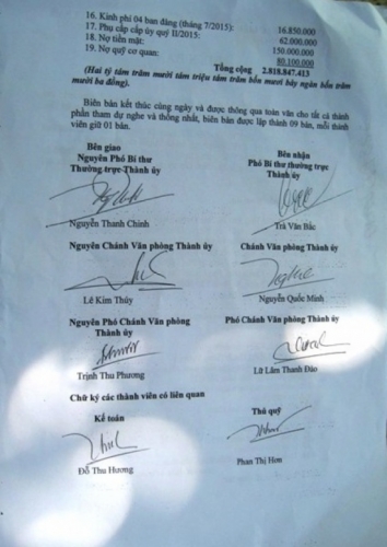 Biên bản bàn giao tài chính tại Thành ủy Bạc Liêu. Ảnh: Thái Đào