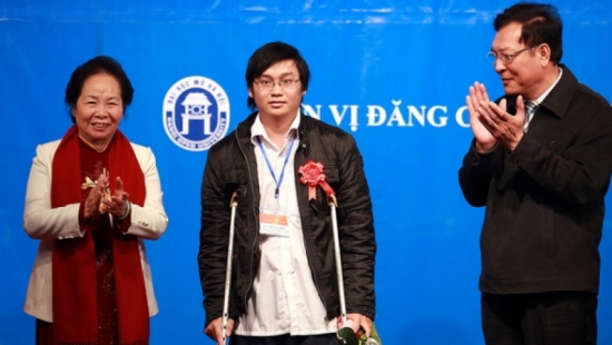 Phó chủ tịch nước Nguyễn Thị Doan và Bộ trưởng Bộ GD-ĐT Phạm Vũ Luận trao giải nhất giải thưởng “Tài năng khoa học trẻ Việt Nam” cho Đỗ Duy Hiếu
