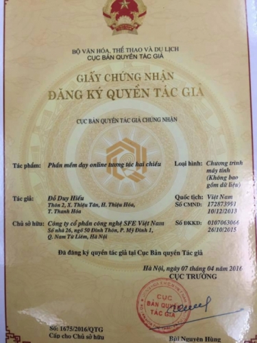 Giấy chứng nhận đăng ký quyền tác giả phần mềm dạy online tương tác hai chiều