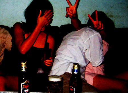 Qua nhã ý của cô gái mặc áo lưới màu trắng sữa, quần jean “ngố” mang giày cao gót, chúng tôi sang ngồi và nhậu chung. Quả đúng họ còn rất trẻ, tất cả chỉ mười tám đôi mươi. Tuy nhiên, những bộ trang phục mà họ khoác trên người thật dễ gây “sốc” với người đối diện. Có cô khoác chiếc áo dày bên ngoài nhưng không cài nút khiến những đường nét cơ thể cứ lồ lộ qua chiếc áo hai dây mỏng manh và rất trễ bên trong.