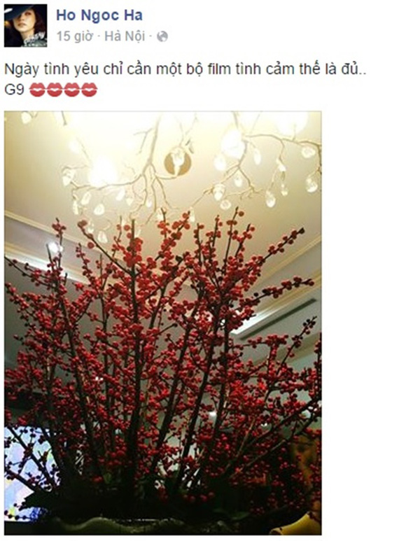 Không chỉ vậy, trên trang Instagram, Hồ Ngọc Hà cũng đăng tải dòng trạng thái "New me, new love". Việc úp mở này của "nữ hoàng giải trí" khiến nhiều người suy đoán người đàn ông giấu mặt trong ảnh chính là người tình bí mật của cô. Trước đó, cô cũng chia sẻ hình ảnh đón Valentine và cho biết: "Ngày tình yêu chỉ cần một bộ film tình cảm thế là đủ".