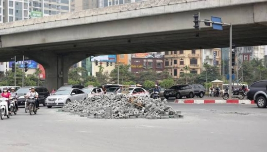 Ghi nhận tại hiện trường, hàng nghìn viên gạch đổ la liệt giữa ngã tư khiến xe cộ đi lại gặp nhiều khó khăn.