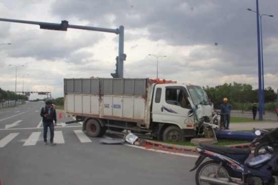 Ghi nhận tại hiện trường, cột đèn chiếu sáng bị gãy, nằm chắn ngang đại lộ Mai Chí Thọ. Chiếc taxi bị hư hỏng phần đuôi, kính vỡ vụn. Riêng chiếc xe tải bị hư hỏng nặng phần đầu. May mắn không có ai bị thương.
