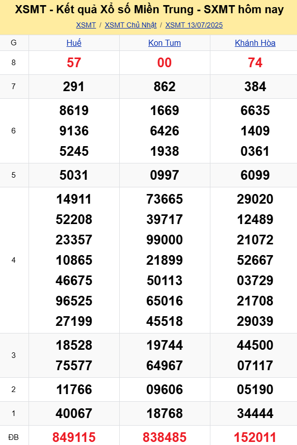 Theo dõi Pháp luật & Xã hội trênXSMT. KQXSMT 13/7/2025. KQXSMT. Xổ số miền Trung hôm nay 13/7/2025. Kết quả xổ số miền Trung ngày 13/7. XSMT 13/7. KQXS miền Trung. xổ số miền Trung Chủ nhật. Cập nhật kết quả xổ số miền Trung hôm nay...